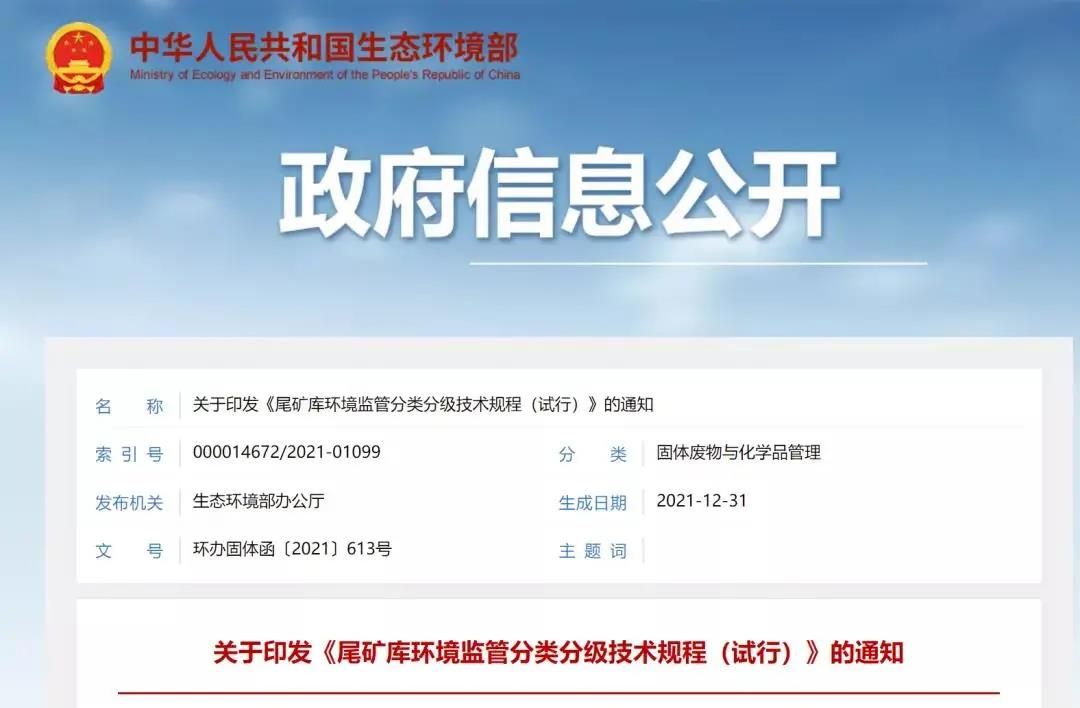 近日,生態環保部網站公布關于引發《尾款庫環境保護分類分級技術規程(試行)》的通知。根據通知《尾款庫環境保護分類分級技術規程(試行)》,該技術規程于2021年12月31日生成。這是尾款庫監督管理方面極其重要的一項新的技術規程。