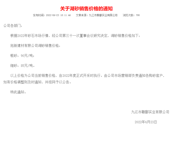 三,鄱陽湖砂:鄱陽湖砂近期銷售進(jìn)展較好,自6月23日公布湖砂價格以來,采區(qū)船只密集,排號船只可達(dá)百條,下游需求恢復(fù)期間,采區(qū)價格未有變動,目前貿(mào)易商或者代理商在采區(qū)價格之上浮動約為2-4元即可上船。以下是調(diào)價通知: